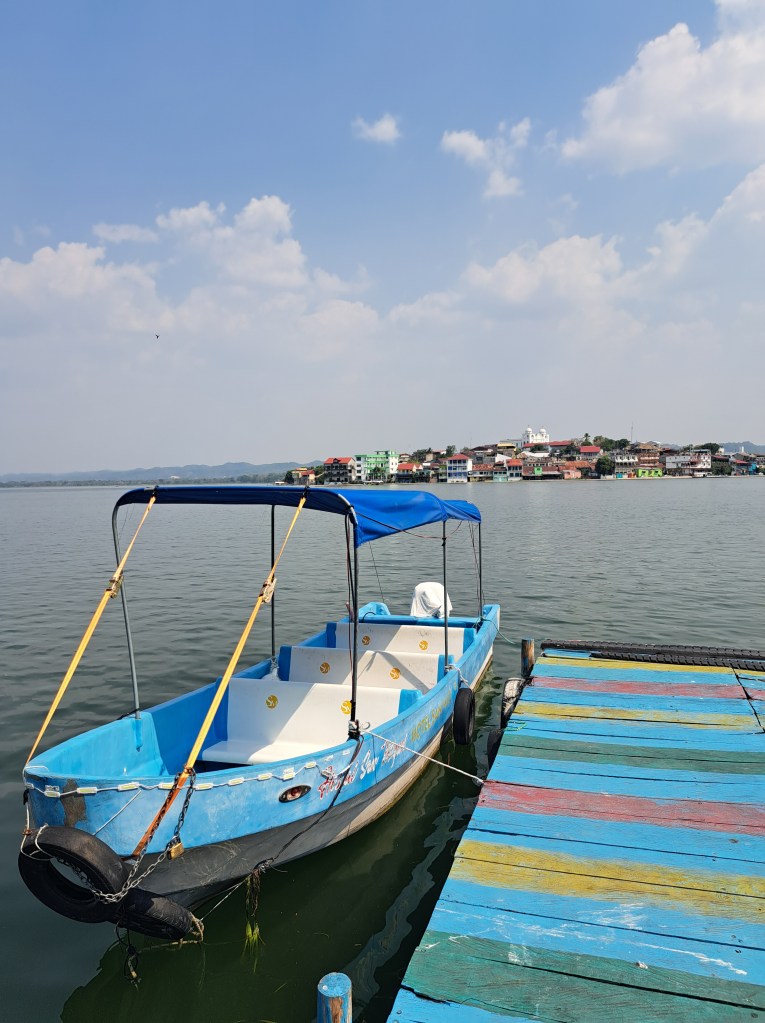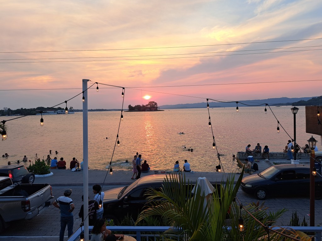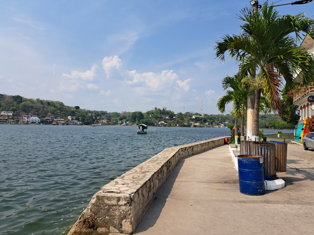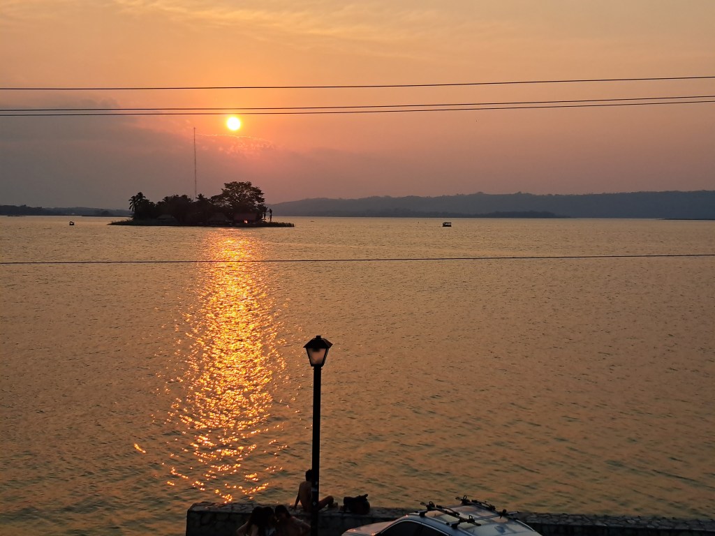 Als ich in Flores ankomme, sollte eigentlich schon die Regenzeit begonnen haben, die auch hier Winter genannt wird. Eine höhnische Bezeichnung für Nordeuropäer, denn der guatemaltekische Winter bringt die Tages-Durchschnittstemperatur lediglich von 33 auf 30 Grad runter und hat recht wenig mit dem zu tun, was wir als Winter bezeichnen. Dank des Klimawandels aber ist es, ähnlich wie in Panama und Kolumbien, nicht mehr so einfach Regenzeit und Trockenzeit vorherzusagen. Was früher zu festen Zeiten im Jahr begann und endete, hat heute keine Gesetzmäßigkeit mehr. Die Tagesdurchnittstemperatur von 30 Grad wurde während meiner zwei Wochen in Flores jeden Tag morgens zwischen 9 und 10 Uhr geknackt und erhöhte sich an mehreren Tagen bis auf 47° C. Ein Leben ohne Pool oder Klimaanlage, oder großen See vor der Nase, war also unvorstellbar. Zum Glück hatte ich alle drei zur Verfügung.