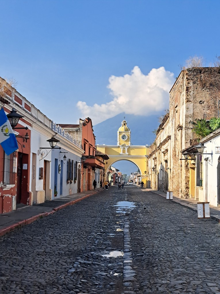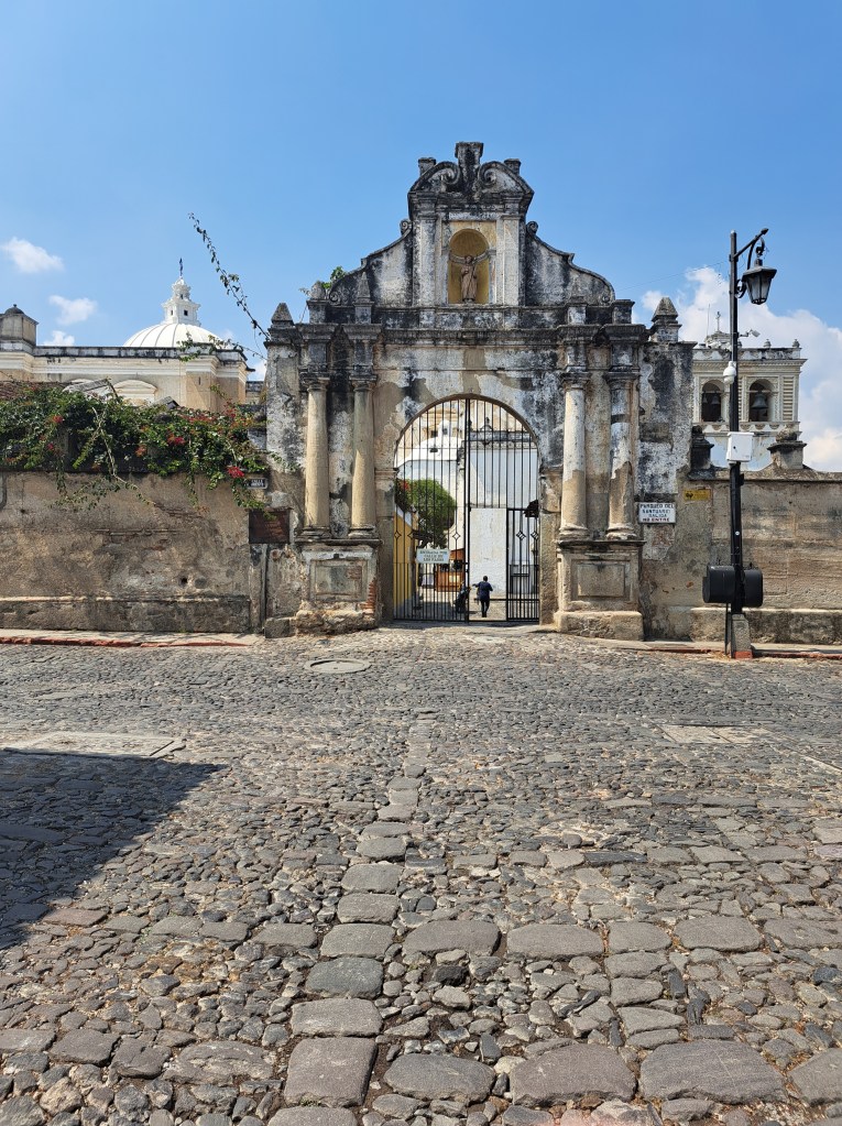 Antigua ist die alte Hauptstadt Guatemalas, die aber 1773 nach mehreren Erdbeben und Vulkanausbrüchen verlassen wurde, um die neue Hauptstadt Guatemala-Stadt ein paar Kilometer weiter im Landesinneren zu gründen. Antigua liegt am Fuße dreier Vulkane, wobei zwei davon aktiv sind und einer, Fuego, in der Woche vor meiner Ankunft anfing Feuer zu spucken. Mitte des 19 Jahrhunderts kehrten die Menschen dann in die verlassene Stadt zurück und als dann die ersten Archäologen kamen und sich Antigua als historisch interessant herausstellte, fror man es einfach ein.