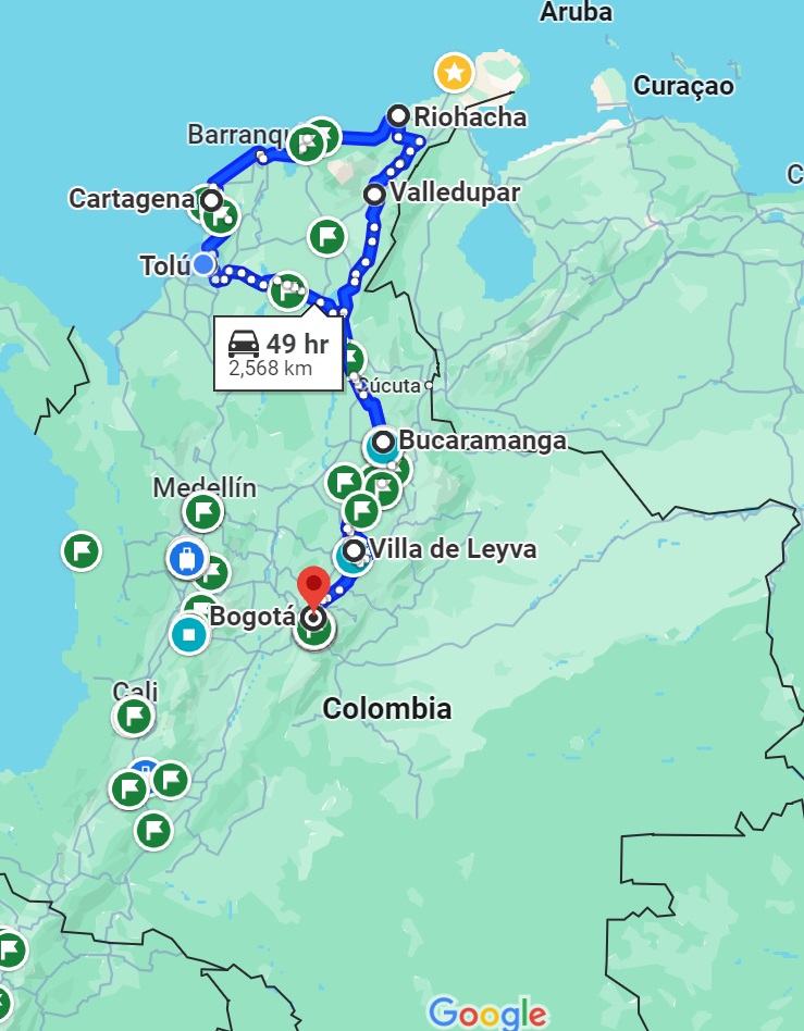 Die Route der nächsten Monate sieht nun wie folgt aus: In Bogotá geht es los, früh morgens um dem Verkehr zuvor zu kommen. Von dort geht es über Villa de Leyva und San Gil nach Bucaramanga. Die Zwischenstopps sind so gewählt, dass sie nach ca. 4 Stunden Google-Fahrtzeit erreichbar sind. Da ich lange Strecken noch nicht gewohnt bin und Strecken hier in Kolumbien allgemein wesentlich langsamer überbrückt werden können, als, sagen wir, auf der Autobahn, soll die Zeit als Maßstab dienen. Die jeweils ca. 3,5-4,5 Stunden Fahrtzeit übersetzen sich in etwa auf 150-190 km Weg.